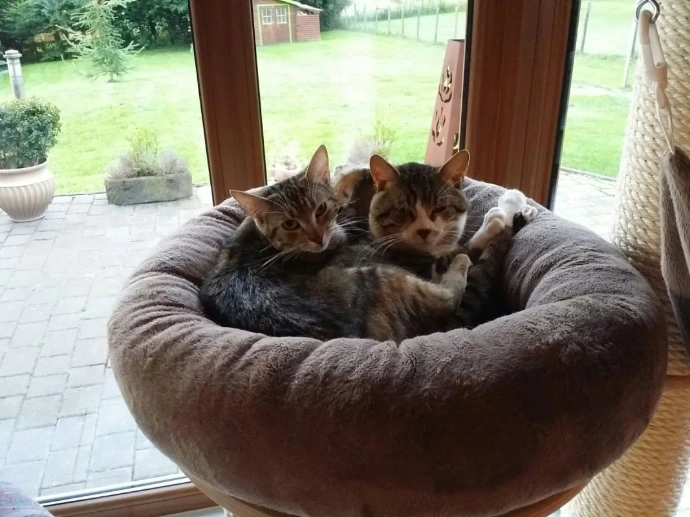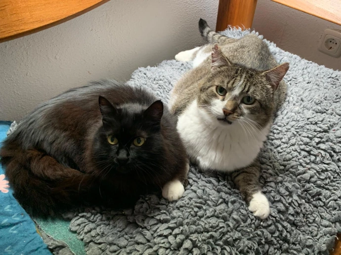 Seitdem geht es Baltia gut, sie hat sich mit den anderen Pflegekatzen angefreundet, auf dem Foto sieht man sie links mit ihrem liebsten Freund Tomi.